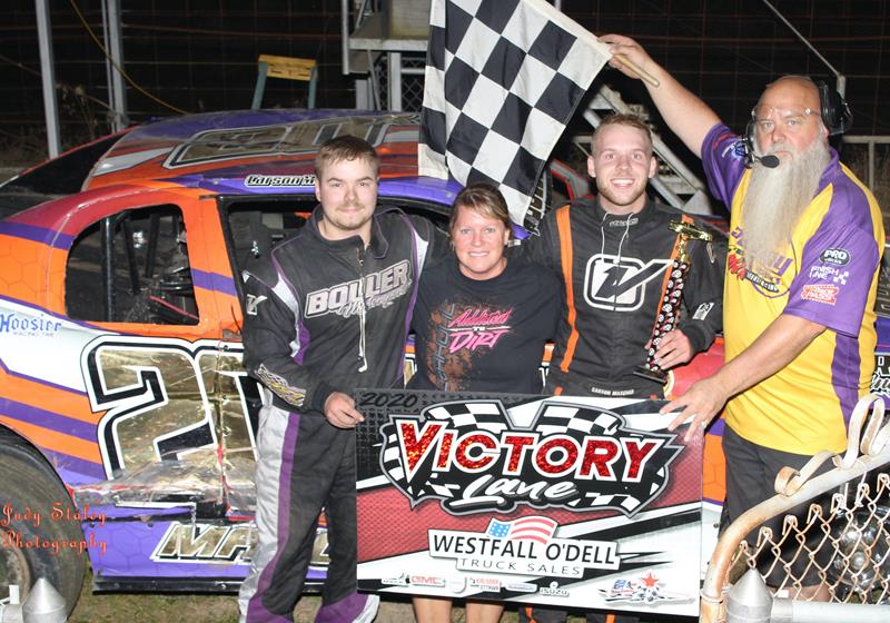 In the IMCA Modifieds, Chad Clancy got out front on lap one and cruised to his second trip to Westfall GMC Victory Lane in 2020. Steven Bowers Jr. charged up to a second place finish, his sixth top five of the season. Josh Munsen finished third, with current points leader Chad Andersen in fourth. Mark Schafman completed the top five.