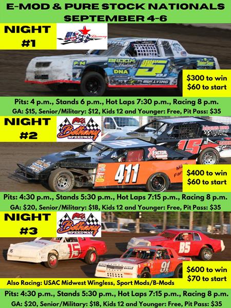 It is also night one of the E-Mod and Pure Stock Nationals. The E-Mods and Pure Stocks are racing for $300 to win and $60 to start. Night number two and three take place at Bethany Speedway. Night two pays $400 to win and $60 to start, while night three pays $600 to win and $70 to start. The top 16 in combined points from night one and two will transfer directly into the finale on Sunday.